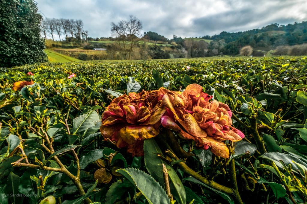 Deixando o tanque para trás caminhei longos metros junto da levada que corre pelo meio da plantação do chá, o que é muito aprazível porque neste momento só se ouve o barulho da água a correr e dos pássaros. Metida com os meus pensamentos lá fui eu relaxada a pensar no enorme privilégio que estava a ter o de poder caminhar numa paisagem única em toda a Europa, uma plantação de chá, até que cheguei a umas escadas que me levaram a uma ponte em arco romano. Este arco é construído em pedra, a qual não está nem rebocada nem pintada e no tabuleiro há uma cartela onde se pode ler “J.G. 1962”.