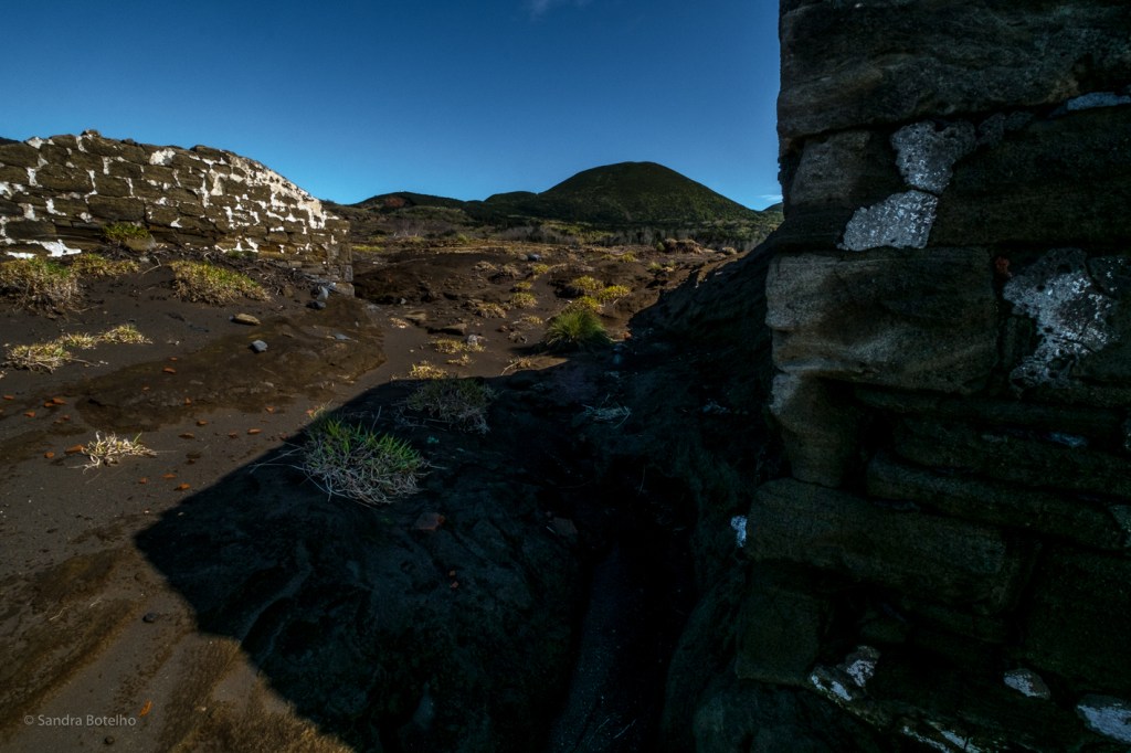 Voltei ao carro para ir buscar a minha mochila e neste pequeno espaço de tempo já o local se tinha enchido de turistas e num ápice lá se tinha ido o meu silêncio, mas o ter “companhia” nunca foi nem nunca será impeditivo para caminhar, bem pelo contrário, sempre se encontra algum turista simpático com quem se pode trocar um dedo de conversa, sempre se aprende e descobre alguma coisa nova. Assim, lá fui eu à minha caminhada, saí do parque de estacionamento do Centro de Interpretação do Vulcão dos Capelinhos e segui para norte, rumo a uma antiga vigia baleeira que se encontra a escassos metros da minha posição inicial, esta foi completamente destruída pela à erupção do Vulcão dos Capelinhos. Ao chegar às suas ruínas tenho uma visão magnífica sobre a cratera e sento-me a imaginar aquele local antes daquele acontecimento, dali só se devia ver o mar e os dois ilhéus existentes, que desapareceram engolidos pelas escórias e cinzas vulcânicas. Absorvida pelos meus pensamentos vem-me à cabeça a informação que havia lido naquela placa informativa, foi daquele local que se avistaram as primeiras manifestações vulcânicas dos Capelinhos e começo a imaginar o dia do Sr. José Soares da Cunha, o vigia de serviço a 27 de setembro de 1957, ao chegar ao seu local de trabalho, por volta das sete horas da manhã, sentar-se para mais um dia de trabalho que pensava ele ia ser rotineiro e que afinal acabou por ser tudo menos rotineiro. Penso na cara de espanto que deve ter feito quando se sentou e olhou para o mar e viu a menos de um quilómetro quatro pontos efervescentes que lançavam escórias e vapores de água e penso será que correu para o aglomerado de casas em sobressalto ou veio a andar calmamente até à vila para avisar aquilo que tinha visto. Neste dia, por certo, não lançou o foguete, pois se o tivesse lançado seria sinal de avistamento de baleia e os pescadores ter-se-iam feito ao mar para mais um dia de trabalho. Não pude deixar de pensar que o vulcão manteve-se ativo e em erupção durante treze meses, a última manifestação é datada de 24 de outubro de 1958 e claro durante todo este tempo a população residente na Ilha do Faial viveu com medo e em sobressalto e, obviamente, que isto trouxe consequências para a ilha, uma vez que durante a ocorrência deste evento 35% da população aqui residente acabou por emigrar para o Canadá e América originando grandes mudanças demográficas.