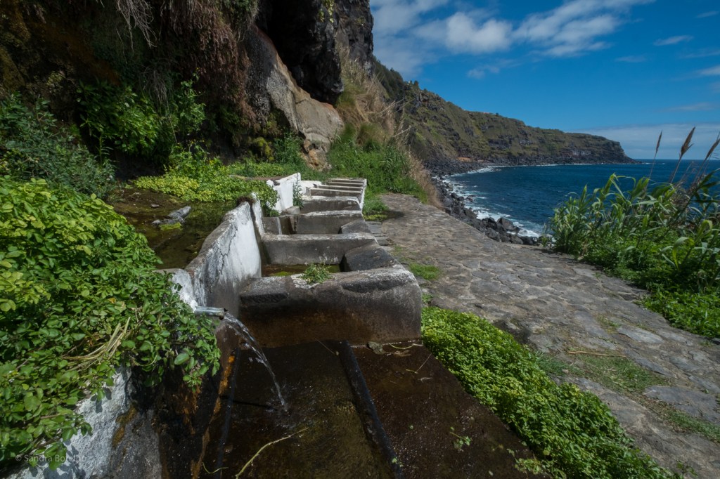 A descida até às pias faz-se por um caminho de terra batida, com cerca de 800 metros, que vale a pena percorrer porque, para além das pias, temos acesso a um calhau de pedra rolada, que nos proporciona uma vista do recorte da costa da ilha e quem quiser pode dar aproveitar e dar um mergulho.