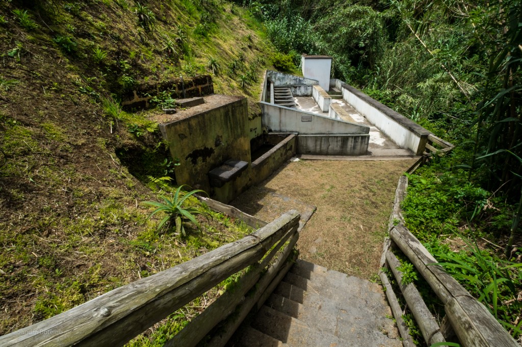 Chegada a Santo António comecei por descer a Rua da Fonte Grande que leva a um parque de merendas. Este parque é pequeno, no entanto, tem uma vista fantástica sobre toda a costa nordeste da ilha de São Miguel. Comecei por explorar o local e lá encontrei a pias antigas que foram recuperadas em 2004 e pensei para mim: “Querem ver que fiz todo este percurso para fazer uma caminhada de apenas 10 minutos?”. Isto porque não estava a ver mais nenhum caminho que me pudesse levar às nascentes, contudo, continuei a explorar a zona, uma vez que estava determinada em encontrar as tais nascentes. Não foi preciso andar muito para notar que do lado oposto às pias havia mais uma via de pé posto que parecia descer para uma zona de calhau rolado e como não posso ver caminhos que tenho de ir ver onde acabam lá fui eu encosta a baixo na companhia da minha catana, caso fosse necessário desbravar alguma parte do percurso. Na descida passei por vários reservatórios de água e por uma levada. A via por mim percorrida termina junto ao mar e neste local é possível observar o que resta de uma antiga central hidroelétrica.