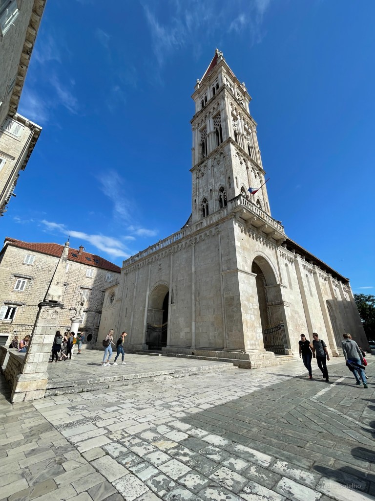 A rua por onde cheguei vinda do continente levou-me à Praça Principal (Praça João Paulo II ou em croata Trg Ivana Pavla II), à minha esquerda a Catedral do Trogir também conhecida por Catedral de São Lourenço (Katedrala Sv. Lovre). Esta catedral foi construída sobre as fundações de uma catedral cristã primitiva que havia sido destruída no século XII, tendo a sua construção começado em 1213 e terminado no século XVII. Tem o modelo mais antigo da construção de arcadas interiores da Dalmácia com pesados pilares alongados com nervuras góticas que separam os dois corredores da nave, posteriormente abobadados em estilo gótico no século XV. Em redor do corpo principal da catedral existem três absides semicirculares e um interior abobadado por cima do qual se ergue a torre sineira (campanário). Segundo consta, havia planos para a construção de duas torres, no entanto, só a torre do lado sul foi construída. A torre começou a ser construída no século XIV e terminada no século XVI, conta com 47 metros de altura e quem tem vertigens vai sofrer para a subir, mas uma vez lá em cima ficará boquiaberto com a vista.