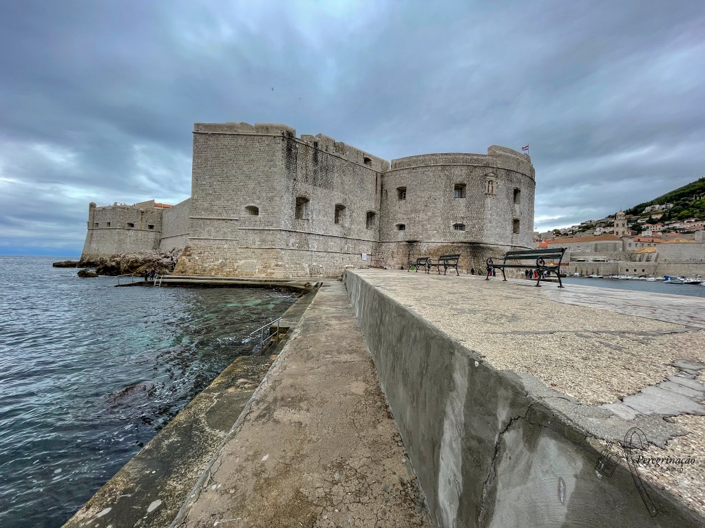 A chuva voltou e desta vez veio para ficar, mas não me deixei abalar pela chuva decidi continuar a explorar a cidade antiga como se estivesse um lindo dia de sol, voltei ao Stradun que estava ainda mais bonito praticamente vazio de pessoas, aquela pedra calcária branca polida por anos de uso parecia um espelho de tanto que brilhava. Estava na hora de deixar as muralhas e explorar os arredores da cidade antiga, percorri uma última vez o Stradun e segui rumo ao Forte de São Lourenço (Lovrijenac) que é sem dúvida um símbolo por excelência desta cidade, construído em pedra num rochedo a 32 metros acima do nível do mar pelos habitantes da República de Ragusa para se protegerem da constante ameaça dos venezianos. Há quem o chame de “Gibraltar de Dubrovnik” devido à semelhança entre o rochedo onde está implementado o forte e o rochedo localizado no extremo sul da Península Ibérica. Segundo documentos da época levou 3 meses a ficar pronto o que para o início do século XI é um feito. Este forte tornou-se o símbolo da resistência de Dubrovnik na entrada principal pode ler-se a seguinte inscrição que virou um dos lemas desta cidade e que a rege desde a sua era dourada do século XIV: “Non bene pro toto liberas venditur auro”, ou seja, “ a liberdade não se vende por todo o ouro do mundo”. Para aqui se chegar é preciso subir 200 degraus, mas a subida compensa uma vez que lá dentro temos uma vista espetacular para as Muralhas de Dubrovnik e Baia de Pile.