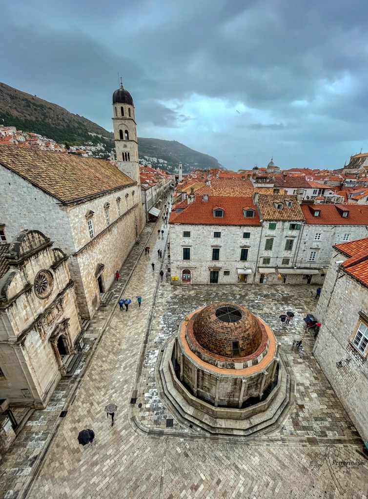 Passar pelas muralhas invencíveis de Dubrovnik é como viajar no tempo e acordar numa cidade medieval. Um dos locais onde pode entrar neste mundo mágico é Porta Pile construída no século XV fica no extremo ocidental do Stradun tem dois arcos e a coroar esta porta está o padroeiro da cidade São Brás (Sveti Vlaho). Em outros tempos existia uma ponte levadiça que era içada todas as noites e um fosso de água que na atualidade é um espaço verde. Já dentro das muralhas há um sem número de edifícios a conhecer que se alinham ao longo do Stradun (Placa em croata, é uma via de uso exclusivo para peões), que é a artéria principal da cidade antiga. Esta rua mede cerca de 300m, foi construída no século XII e pavimentada com pedra calcária no século XV. No início desta rua abre-se um largo que tem nele implantado uma fonte, construída na primeira metade do século XV, obra do arquiteto Onofrio di Giordano della Cava, de Nápoles. Esta fonte é conhecida pelo nome a fonte Grande de Onofrio faz parte do sistema de abastecimento de água desta cidade antiga tem a forma dum polígono de 16 faces decoradas com 16 máscaras todas elas diferentes entre si a água sai da boca das máscaras caindo para as pias que existem na base da fonte. Esta fonte era encimada por 16 cães, mas durante a Guerra da Independência da Croácia de 1991 esta fonte foi bombardeada ficou severamente danificada e na atualidade dos 16 cães só um cão sobrevive a coroar a fonte. Em frente a esta fonte temos a singela Igreja renascentista dedicada a São Salvador (Sveti sv. Spasa) construída no século XVI, hoje já não tem as funções de igreja. No seu interior uma pintura de 1528 intitulada “Ascensão” da autoria do pintor Pietro Antonio da Urbino. Ao lado a igreja e mosteiro Franciscano (Franjevacki samostan) construídos no século XIV. O mosteiro tem um claustro românico com alguns elementos góticos. Neste claustro existem 120 colunas com capitéis decorados com motivos de plantas e animais. No centro do claustro, há um poço de pedra com uma estátua de São Francisco. Este convento anexa uma biblioteca e uma farmácia medieval (Stara Ljekarna). A biblioteca abriga cerca de 30.000 livros históricos sobre medicina e corais de igrejas e a farmácia que ainda funciona na atualidade foi estabelecida pelos monges em 1317 é a terceira farmácia mais antiga do mundo. Ainda é possível verem-se os móveis originais e as ferramentas que os monges usavam para fazer as receitas.