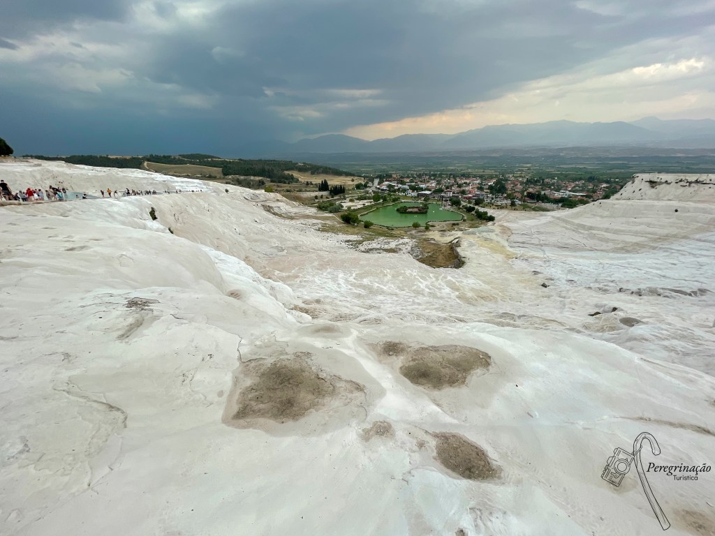 E era tempo de meter outra vez pé na estrada e rumar a Pamukkale, onde me estava reservada a surpresa do dia, chuva e trovoada, para que as saudades do clima dos Açores acabassem. O medo da trovoada era imenso caia ali tão perto! Mas, tudo se fez e já na descida para Denizli o tempo virou, melhorando e lá conseguimos visitar estas piscinas termais de origem calcária, que com o passar dos séculos formaram bacias gigantesca de águas que descem em cascata por uma colina. Contudo, digo-vos, desde já, que andar tanto quilómetro para aqui chegar e encontrar as poças vazias para mim foi uma desilusão. No entanto, como em tudo na minha vida, vejo sempre o lado positivo das coisas e, neste caso, fui compensada, se por um lado a companhia de viagem era uma bênção, por outro lado a mãe natureza decidiu agraciar o final do dia com um pôr-do-sol majestoso. Nas imediações destas poças, a antiga cidade de Hierápolis aqui estabelecida no século II a.C. por Eumenes II, Rei de Pérgamo. No ano 17 d.C. durante o reinado de Tibério foi destruída por um terramoto, mas a mesma voltou a ser reconstruída, uma vez que os nobres romanos, de todo o império, vinham para aqui atraídos pelas águas termais.