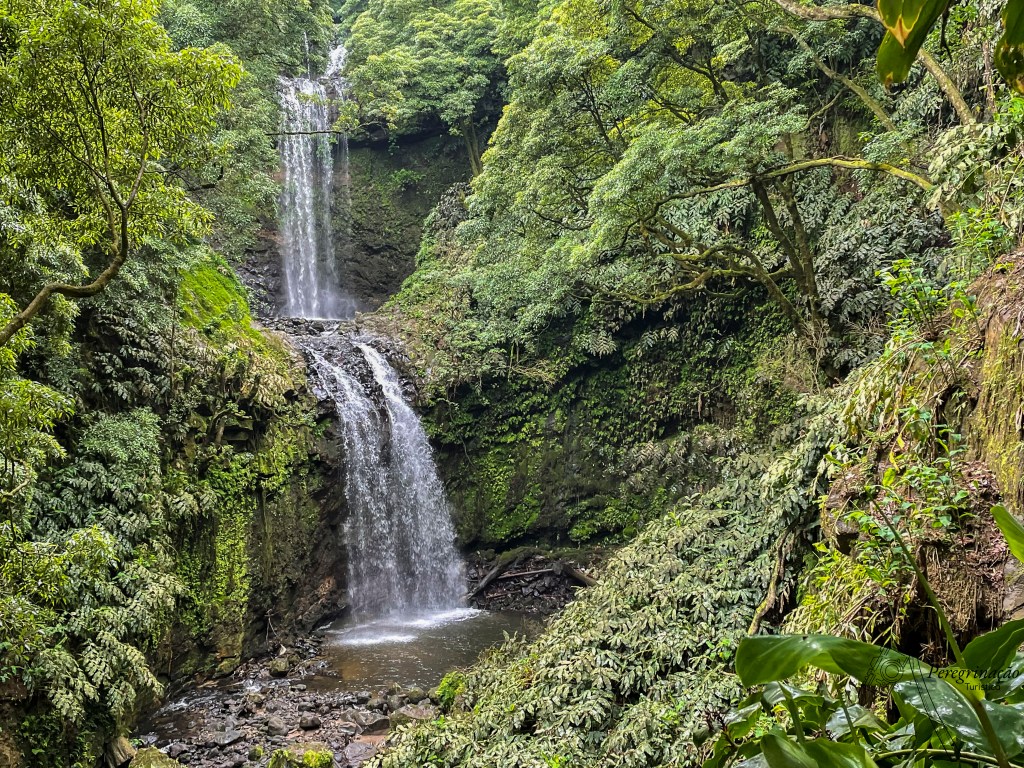 Barquinha aguarda-me que estou a caminho! Iniciei a trilho não no início oficial e sim na Rua do Fim da Lomba só para ser diferente. Depois deixei fluir e segui rumo ao percurso oficial por caminhos alheios, porque uma vez diferente para sempre diferente e já que tinha começado o trilho à minha maneira haveria de o fazer todo ao contrário… comecei a descer por um caminho de terra batido cheio limos, pura adrenalina descer sem escorregar e após alguns metros de adrenalina encontrei uma placa/seta na qual se lia “caminho difícil”, alegria! Embora mantermo-nos no caminho difícil, porque levam a destinos incríveis e eu sabia de antemão que sim, iria ver a cascata das três bicas que é deslumbrante, penso que assim se chama porque tem três saltos. Aqui já tinha entrado em caminho oficial pelo que era seguir a sinalética que indicava subir.