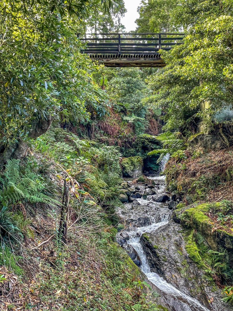 O trilho prossegue com uma subida de escadas que nos guiam para uma mata de incensos, eucaliptos e criptomérias. No cimo destas escadas há um pequeno desvio à esquerda que nos leva a uma cascata pequenina, mas muito encantadora, bom na realidade sou suspeita para falar de cascatas porque para mim todas as cascatas são bonitas. Voltando ao trilho embrenhamo-nos pela mata para mais à frente e após subir mais umas quantas escadas, que segundo a anfitriã, antes não existiam e que para ali se chegar teríamos de o fazer subindo por umas cordas, só posso deduzir que esta devia ser uma boa zona para estimular a adrenalina, viramos à esquerda e tentamos ir ver a cascata que existia na zona, mas a ribeira estava composta e como não tínhamos sapatos para trocar decidimos voltar para o caminho do trilho. Ao regressarmos ao caminho dei que tinha uma bifurcação e nesta altura descobri que a menina da Ilha Rainha era bem pior do que eu para aventura não é que me desafiou a virar à direita para o caminho errado usando o argumento, “não é a menina que gosta de ver todos os cantos nos trilhos”. Eu como não estava na minha terra e também estava sem GPS não estava muito tentada a sair dos eixos, mas a curiosidade tinha-se instalado em mim, gostava de ir ver onde o mesmo ia acabar pelo que aproveitei a deixa e lá fui eu. No entanto, devo confessar que fiquei desorientada com o incentivo e perguntei se me estava a enganar, se aquele caminho que estávamos a fazer não seria o caminho que tínhamos percorrido inicialmente, mas a anfitriã tinha sempre resposta pronta para dar e referiu se eu tinha visto aquela árvore caída no princípio e realmente não tinha visto a árvore. Oh! Não me enganava, estávamos mesmo a ir ver para onde o caminho errado nos levava. Andamos uns metros grandes e o caminho acabava nuns pastos cujos muros eram de pedra solta muito bonitos, sempre me encantou este tipo de construção pela singela forma como são construídos. Voltamos ao caminho certo e nesta zona conseguimos ver a cascata que não conseguimos ver atrás de cima. Terei de aqui voltar para a ver de pertinho porque de cima é encantadora tem dois saltos.