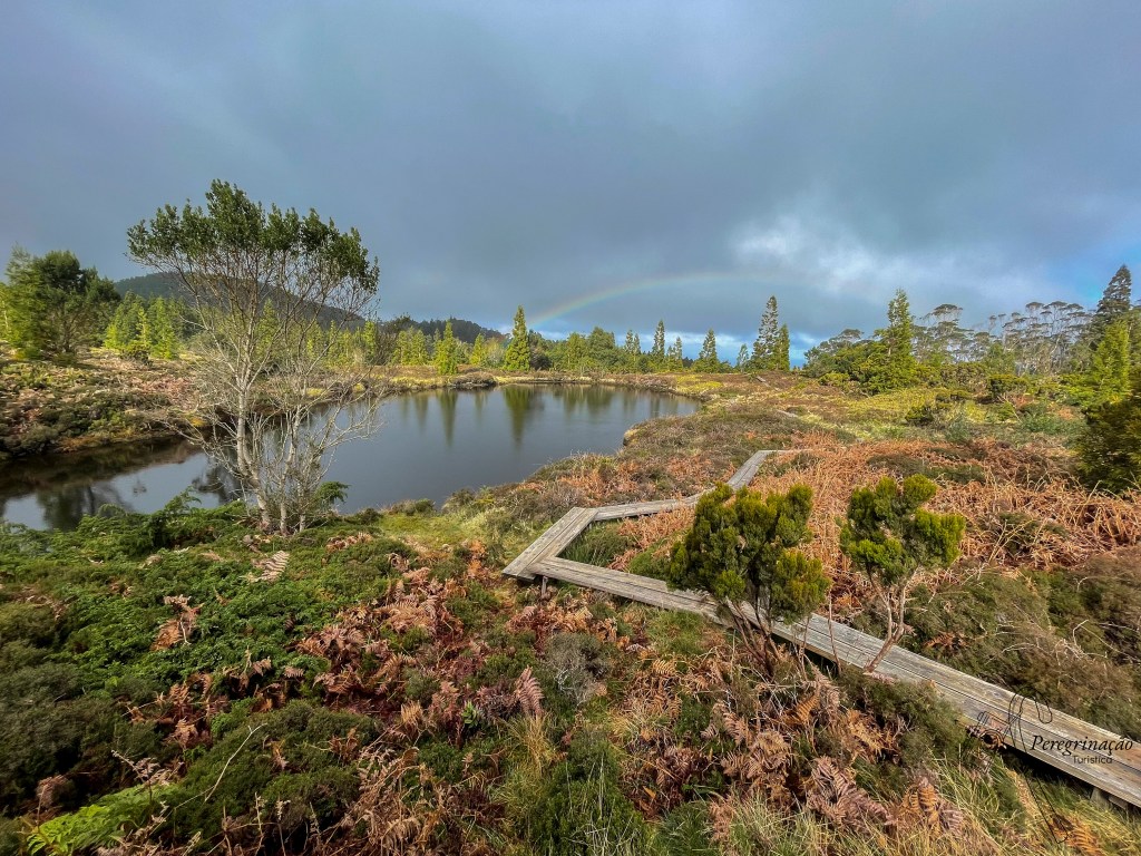 Saindo da mata começamos a ter novamente a ribeira do lado esquerdo a fazer companhia, nesta zona podemos ver os vestígios da moagem que aqui era praticada noutros tempos, no chão vêem-se algumas relheiras e também pulos e regos que eram usados para desviar a água e encaminhar a mesma para os chafarizes e moinhos. Antes de chegarmos ao Parque das Frechas houve tempo de fazer mais um desvio para ver uma cascata artificial, uma vez que corria de um tubo, fui enganada pela ilusão ótica. Prosseguimos caminho e chegamos ao Parque das Frechas, é aqui que nasce a Ribeira da Agualva. De referir que este parque já é descrito por Gaspar Frutuoso que em 1589 no seu livro Saudades da Terra, que escreve o seguinte: “Há neste lugar da Agualva muitos pomares e frescos bosques de árvores e rosales (…) onde muitos homens nobres de toda a ilha e fora dela vão tomar recreação.”. Nesta zona de lazer pode-se desfrutar da natureza no seu estado puro e também ver a mais bonita cascata de todo o trilho. Claro que todos os cantos deste parque foram vistos, fomos à ponte da qual se pode ver a cascata de cima, atravessamos a mesma e fomos até às casas de captação de águas. Após ter visto os cantos todos voltei para o carro feliz e contente. Para mim o dia estava ganho e poderia ter ido para casa relaxar, mas não fui para casa, a menina da Ilha Rainha tinha outros planos para aquele dia que envolviam mais caminhada, coisa que não gosto nada de fazer como é sabido. Seguimos para o carro para irmos visitar a lagoa do Cerro que não conhecia. A caminhada até à lagoa foi agraciada de forma tímida pelo sol que por entre as nuvens aquecia a ilha. A lagoa e mais uma vez sou suspeita para falar, por que são como as cascatas todas bonitas. Esta é pequenina, tem o formato circular e aos meus olhos muito encantadora. Num lado do seu contorno tem um abrigo para observação de aves e foi neste abrigo que almoçamos. No entretanto, a chuva quis abençoar a caminhada juntando-se ao sol formando-se ao longe um arco-íris, todo este cenário e o silêncio que se fazia sentir tornou aquele local ainda mais mágico. Enquanto almoçava observava a lagoa que enquadrada pelas aberturas do abrigo parecia um quadro saído duma tela de Gustave Courbet. E num ápice acordava para a realidade, era tempo de voltar à civilização, ao barulho e à confusão de Angra do Heroísmo, por mim teria ficado perdida no meio do mato.