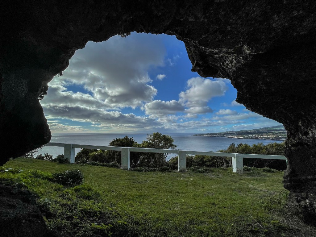 Mal sabia eu o que me esperava na chegada a Angra, quer dizer, já sabia que o meu destino nesta passagem pela Ilha Lilás iria passar pelo Monte Brasil, só não sabia era que iria ser neste dia. Penso que a anfitriã queria despachar-me para que não tivesse mais razões para voltar à ilha e como tal queria fazer tudo num só fim-de-semana (risos). Estacionamos na base do Monte Brasil, sobre este monte falarei mais ao pormenor noutro texto, e seguimos subindo para entrar na fortaleza e explorar o caminho das Beladonas. Aqui neste caminho e segundo algumas pesquisas que fiz poderiam existir mais algumas grutas escavadas pelo ser humano. Assim, e já que as outras grutas são de acesso restrito havia que ir explorar este caminho já que o mesmo é de livre acesso e ver se realmente havia algum vestígio arqueológico. Lá fomos nós à terceira caminhada do dia era aproveitar a boa energia para caminhar da peregrina. Chegamos ao caminho, a peregrina é orientada pelo que todo o santo dia não precisei de ligar o GPS, andamos alguns metros e nada, já eu tinha perdido a esperança de ali existir o quer que seja quando para minha surpresa mesmo no final do caminho encontramos uma pequena cavidade escavada no tufo vulcânico no seu interior um banco também escavado no tufo, fiquei animada ao ponto de batizar aquela cavidade de “hipogeu superior” só para me enganar e pensar tinha visto os hipogeus. De referir que não penso esta cavidade tenho sido escavada por povos antigos, mas alguém a escavou não há dúvidas, suponho eu que talvez algum preso político ou algum dos concentrados alemães que passaram por este monte e que por ele estavam autorizados a passear livremente. Quem quer que seja que a escavou soube escolher bem o sítio uma vez que a vista deste local é muito bonita e coroada com a ilha de São Jorge e Pico na linha do horizonte.