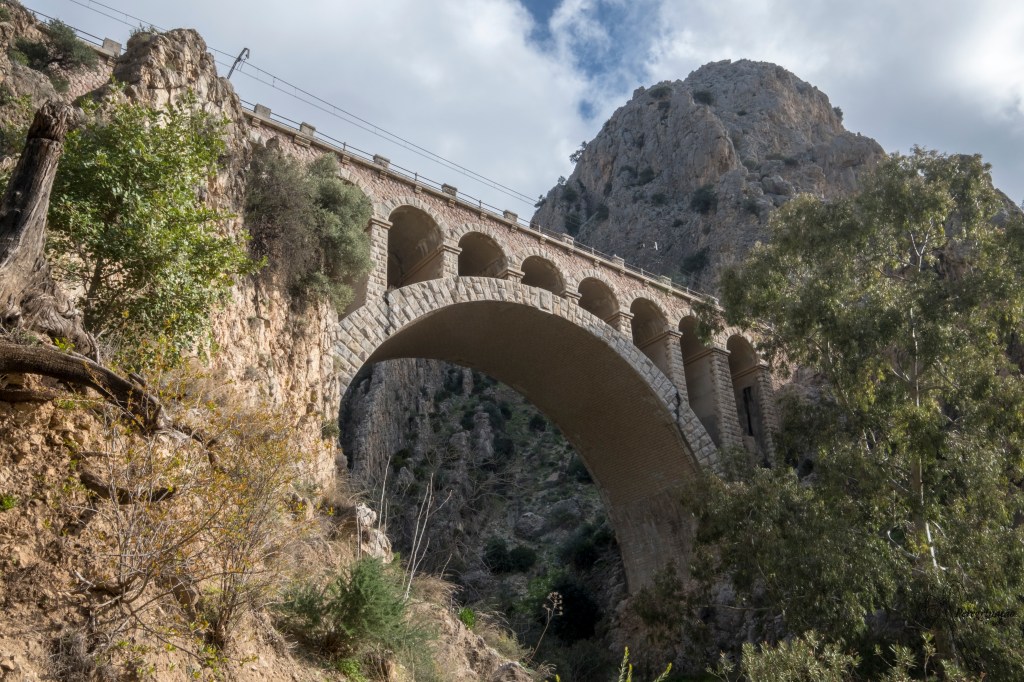 Caminho durante algum tempo por este passadiço, mais à frente entro num vale que parece ser encantado, o Valle del Hoyo, que serpenteia por entre as antigas levadas. Do lado esquerdo vejo o rio Guadalhorce (vocábulo que vem do árabe e significa silêncio) de águas azuis esverdeadas que escavaram o Desfiladero de los Gaitanes, com paredes que alcançam os 700 metros de profundidade. No céu captando a minha atenção estão alguns abutres que me vão fazendo companhia. A caminhada nesta mata encantada estava muito agradável, mas dou por mim a caminhar novamente no passadiço de madeira entrando naquela que para mim é a parte mais bonita do trilho. Nesta zona é possível apreciar a particularidade da geologia deste local, assim como, os túneis e viadutos criados para o caminho-de-ferro que existe do lado oposto ao passadiço. Neste sítio é possível ver o místico passadiço original, sobre o qual está instalado o novo passadiço a mais de 100 metros de altura em relação ao rio. A meio do caminho, instalado sobre uma curva do desfiladeiro como que a coroar o passadiço uma varanda de vidro, da qual se pode observar todo o desfiladeiro. Fico abismada com tamanha beleza. Seria capaz de aqui ficar horas a fio a contemplar aquela paisagem. Nesta varanda tenho a sensação que sou um pássaro prestes a abrir asas e voo para acompanhar os que já estão a planar no céu. Infelizmente não levantei voo, mas digo-vos, a vista para o desfiladeiro é qualquer coisa de fenomenal e daqui conseguimos ver o mesmo na sua totalidade. Sigo caminho, havia que deixar os outros visitantes também serem arrebatados pela beleza observada naquela varanda. Mais à frente chego ao Balconcillo de los Gaitanes, local onde vou atravessar o rio. Vejo a velha ponte suspensa do aqueduto e viro testemunha do quão vertiginoso deveria ser atravessa aquela estreita ponte. Pensei para mim as gentes que aqui trabalharam não tiveram vida fácil. Na atualidade, atravessa-se o rio numa ponte suspensa de metal que fica paralela à primeira. O que dizer sobre atravessar esta ponte? Não é menos vertiginosa que a primeira, contudo, é bastante mais segura. Atravessar a mesma é, literalmente, atravessar o abismo.