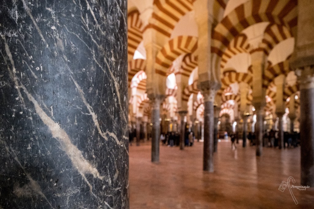 Entro no edifício e deixo-me ficar um pouco no Pátio das Laranjeiras que nos tempos da ocupação muçulmana era o centro da vida islâmica, contemplo os 54 metros de altura do minarete, o qual após a reconquista foi coberto por elementos barrocos e passou a ser o campanário da catedral, aqui aproveitando a sombra das muitas árvores (laranjeiras, palmeiras, oliveiras e ciprestes) e o silêncio que se fazia sentir para me concentrar e entrar na mesquita catedral. Quando entro no edifício fico abismada com a grandeza do seu interior e digo-vos não há preparação que vos prepare para o que vão ver! Deparo-me com uma floresta de colunas e arcos de ferradura pintados de vermelho e branco a perder de vista, onde se destaca a quibla e o mihrab muito elegantemente decorados com inscrições do Alcorão e um arco de ferradura decorado com temas vegetais. Uma curiosidade sobre a quibla, nesta mesquita está mal orientada, uma vez que devia apontar para Meca, mas aqui aponta para o Rio Guadalquivir. Este erro de cálculo deve-se aos arquitetos do califado que imitaram a orientação das mesquitas de Damasco sem terem em conta a posição de Andaluzia no mapa. Percorro as várias capelas que existem nas laterais do edifício e, por fim, chego à parte central onde encontro a Catedral cristão que impressiona, mas deixa a pessoa confusa visto que, supostamente, não deveria estar ali e, no entanto, lá está ela ocupando o antigo espaço dedicado à oração dos muçulmanos.