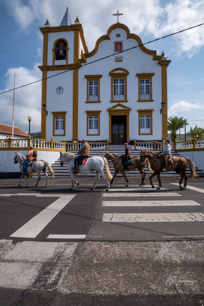 Mais à frente um dos momentos altos da caminhada, chegamos à freguesia das Doze Ribeiras, entramos na Igreja Paroquial dedicada a São Jorge e como já mencionei foi nesta igreja que durante muitos anos a imagem de Nossa Senhora dos Milagres esteve recolhida antes de ir para a sua morada atual. De referir apenas que esta igreja foi mandada erigir sobre a primitiva ermida e que atual construção data do século XIX, no seu interior é muito singela. Ao sairmos da igreja, atravessamos a rua para irmos ver o Império do Espírito Santo das Doze Ribeiras, que tem inscrito no seu frontispício a data de 1989. Retomamos a caminhada e ao longe começo a ouvir o som de cascos de cavalos, não estava à espera de ouvir tal barulho e penso para mim: – Já ando a ouvir coisas. Contudo o ruído dos cascos começou a ficar cada vez mais sonoro e próximo pelo que olho para trás e vejo um grupo de cavaleiros trajados à maneira, imponentes cavalgando nos seus lindos cavalos, paro para apreciar a cena e os meus olhos arregalam-se com a tamanha beleza dos equídeos. Fico com a sensação de que um deles persentia o meu fascínio por estes animais porque começou a exibir-se, quem não gostou desta exibição foi o cavaleiro, uma vez que parecia não ter controlo sobre o cavalo. O grupo seguiu o seu caminho, mas notava-se que os animais estavam um pouco nervosos por estarem na estrada com os carros a passarem muito próximo deles. Mais tarde, quando chegamos à Serreta, cruzamo-nos, novamente, com este grupo de cavaleiros. Neste momento senti-me abençoada por ter visto esta manifestação de fé por parte dos cavaleiros e segui para a Serreta ainda mais alegre. Prosseguimos a nossa jornada passando por um fontenário e por um lindo moinho de vento muito bem conservado que parei para fotografar, mais à frente o miradouro das Doze Ribeiras com o seu baloiço, foi aqui que fizemos uma última paragem para retemperar as energias.