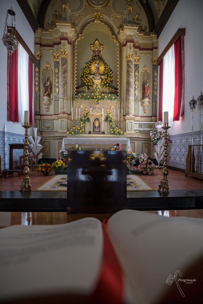 E num ápice a nossa peregrinação estava prestes a terminar, entramos na freguesia da Serreta e começamos logo a sentir no ar o ambiente de festa, o povo, na rua, na azáfama dos últimos pormenores, montava os pórticos para os peregrinos passarem. Quanto mais avançávamos no caminho rumo ao santuário mais festivo ficava o ambiente, algumas pessoas aproveitavam as barracas para retemperar as forças da caminhada, mais perto do santuário, outras aproveitavam para descansar. Antes de entramos no santuário noto que estavam a montar um palco, talvez à noite fosse haver algum concerto. Seguimos, subimos as escadas de acesso ao santuário e aqui o ambiente ficou mais solene, peregrinos de todas as idades entravam e saiam da igreja, outros estavam sentados a rezar ou simplesmente a contemplar e a absorver o momento. Eu aproveitava enquanto a Menina da Ilha Rainha fazia a sua reflexão para ver o interior da igreja, uma vez que não o conhecia. No altar-mor sobre o império a pequena imagem da Nossa Senhora dos Milagres, toda faustosa, que apesar de ser pequenina diz o povo que é muito milagrosa. Volto para junto da minha companheira de caminhada e deixo-me ficar sentada ao lado pensando, refletindo sobre a peregrinação, o quão fomos agraciadas pelo tempo, o sol sempre radioso no céu e o quão aquela caminhada tinha sido alegre e pacificadora.