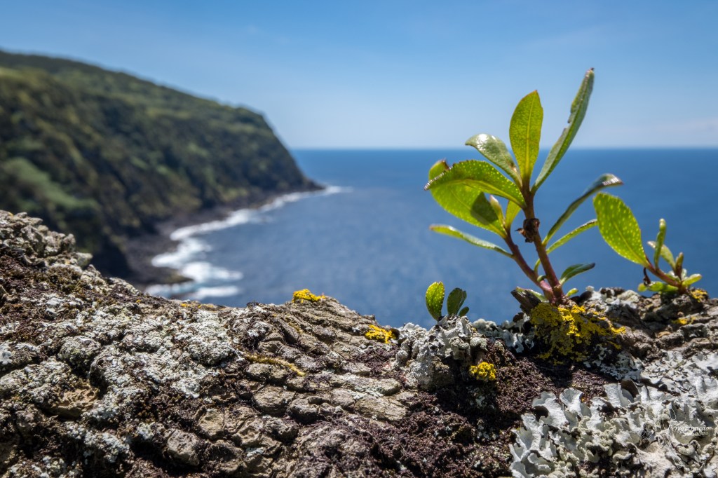 Continuamos a nossa descida passando por uma zona de pastagens com as suas habituais residentes, as vacas. O caminho já há algum tempo passara de bagacina vermelha para terra batida e eu continuava imersa na minha curiosidade, pensando naqueles muros de pedra que a mãe natureza havia reclamado para si, o que eles estavam ali a fazer e não tardou muito para ver satisfeita a minha curiosidade. Uma vez chegadas à Fonte da Fajã, veio as tão esperadas respostas às nossas questões. Tal como já suspeitávamos, existiu aqui em tempos idos uma povoação de seu nome Fajã, cujos habitantes estavam agregados aos Altares até ao início do século XIX. A fonte, e segundo a placa informativa, não tinha água potável para os animais matarem a sua sede e os que dela bebiam definhavam e acabavam por morrer.