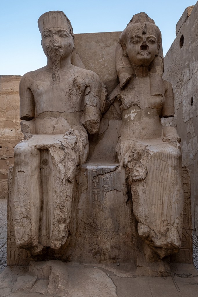 Quase vencida pelo calor abrasador sigo para os Colossos de Memnon, são assim chamados porque na era cristã os gregos visitaram o templo e ao ver as estátuas estas pareceram ser Memnon filho de Eos – deusa do amanhecer, um grande herói grego morto por Aquiles. Estes colossos são duas estátuas gigantes de quartzito, medem 18 metros de altura, cada uma pesa 1.300 toneladas e foram mandadas construir pelo Faraó Amenófis III, há 3400 anos. Estas representam o próprio faraó sentado no seu trono, ao lado das suas pernas está a sua mãe, Mutemuia e também a sua esposa, a rainha Tié. Nos dois lados do trono há um símbolo que representa a união entre o Alto Egito e o Baixo Egito. A função destas estátuas era serem as guardiãs do antigo templo funerário de Amenófis III que ali existia e que e ocupava uma área de 385.000 metros. Deste antigo templo só sobram mesmo estas duas estátuas, o resto desapareceu devido ao fruto de pilhagens repetidas e, como estava localizado dentro da área de inundação do Rio Nilo, o calcário usado na sua construção foi-se desgastando por séculos de exposição às cheias anuais deste rio.