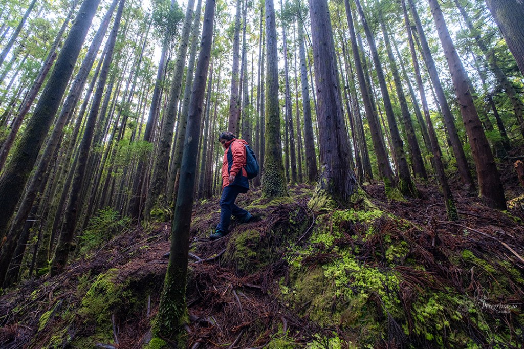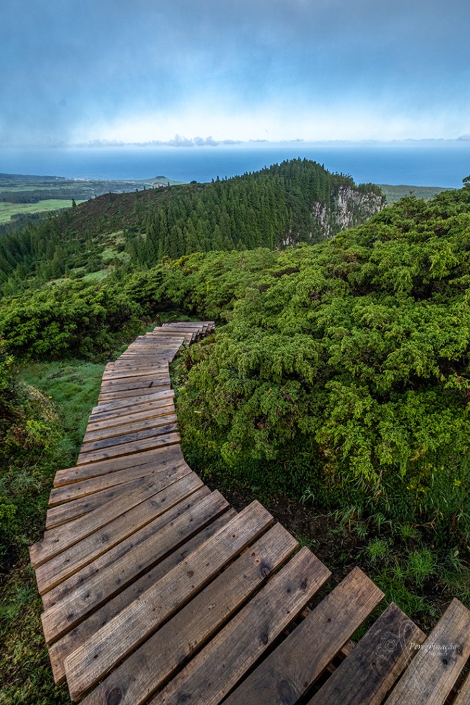 Deste ponto iniciamos a descida rumo a uma clareira onde fomos acompanhadas pela muita vegetação endémica, musgo, cedro-do-mato, entre outras e digo-vos que descida esta, começamos por passar por umas escadas de madeira que nos levou a um o terreno bem lamacento e escorregadio. Nesta zona não sabia o que fazer, se apreciava as plantas, se apreciava as paisagens, que eram deslumbrantes, lá longe via-se a sempre majestosa Serra de Santa Bárbara ou se me concentrava onde metia os pés para não cair, esta última acabou por ser o meu maior foco para ver se não me lesionava. Aqui bem tentamos não ficar muito sujas, mas com tanta lama tornou-se missão impossível, nem mesmo havendo alguns sítios onde haviam madeiras para transpormos o lamaçal íamos conseguir sair ilesas à sujidade, porque para compensar as madeiras, aqui e acolá eram muitos mais os sítios que não havia nada e cada passo dado era sinónimo de enfiar o pé na lama até à canela, apesar das peripécias todas lá saímos da clareira enlameadas sujas, mas sem mazelas. Começamos a subir uns degraus desiguais que nos levaram a uma mata de criptomérias e, eventualmente, acabamos por chegar aos inevitáveis degraus de grade de ferro, digo-vos não sei se esta zona é melhor a subir ou a descer, já fiz nos dois sentidos e nenhum é fácil para quem como eu é de baixa estatura. Para cima são degraus para gigantes e para baixo são degraus bons para as articulações dos joelho, tal como costumo dizer em tom de brincadeira: “Quem constrói os degraus dos trilhos só deve fazer o percurso a vez em que os constrói, porque é com cada degrau que é de bradar aos deuses”.