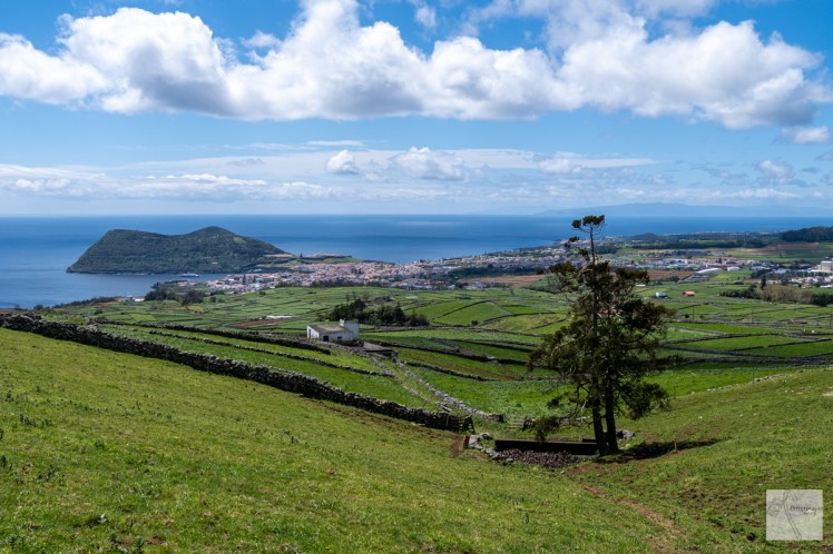 Prosseguimos a nossa subida e conforme íamos subindo arranjámos novos companheiros, o vento e, com ele, o frio. A subida levou-nos a uma via de asfalto e ao Miradouro da Janela cuja sua localização fica a 410 m acima do nível do mar e tem uma vista ofegante sobre praticamente todo lado sul da Ilha Terceira. E fico a pensar que em dias de céu limpo devem ver-se na linha do horizonte as ilhas de São Jorge e Pico. Pelo que começo logo a idealizar uma fotografia deslumbrante na minha cabeça criando em mim uma vez mais razões para voltar a fazer o trilho. O tempo estava a ficar desagradável, muito frio e vento, decidimos avançar deixamos a janela e o baloiço do miradouro para explorar noutra caminhada e voltamos à rua de asfalto, na qual andamos por largos metros e foi numa estrutura abandonada, que encontramos no cimo da serra, que paramos para almoçar, o tempo estava bastante agreste e, momentaneamente, voltou a chover, acabamos de comer as nossas deliciosas sandes e retomamos a caminhada pela rua de asfalto. Uns metros mais à frente fizemos um pequeno desvio para irmos visitar o Miradouro do Morro, na descida até ao miradouro fico assoberbada com os afloramentos rochosos, chego ao limite mirante e fico de respiração cortada com a vista para o interior da ilha, os pastos separados por muros de pedra, a que os locais chamam manta de retalhos e vemos também os muitos cones vulcânicos existentes. Onde estamos o complexo desmantelado da serra da Ribeirinha talvez se tenha constituído dos restos, possivelmente, do primeiro vulcão que formou a ilha Terceira. Uma curiosidade sobre este miradouro, durante a Segunda Grande Guerra Mundial esta elevação foi ponto de controlo militar. Voltámos ao caminho de asfalto e descemos até à zona de lazer da Ribeirinha, na qual noto a existência de um campo de futebol e penso para mim que de inverno não deve ser fácil jogar-se ali devido ao vento que se faz sentir. Entramos neste espaço, virámos à direita e fomos ao Miradouro do Parque, no qual existe uma moldura que enquadra a paisagem com o sempre maravilhoso Monte Brasil como pano de fundo. Este miradouro localizado em plena Serra da Ribeirinha, daqui temos uma vista fascinante sobre os Ilhéus das Cabras, Ladeira Grande, Ribeirinha e cidade de Angra do Heroísmo. E, uma vez mais, fico a imaginar a vista deste local em dias de céu limpo com as ilhas do Pico e São Jorge na linha do horizonte.