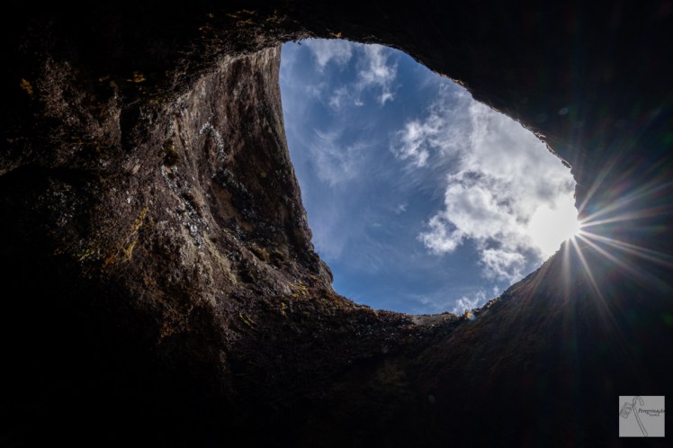 Voltamos ao caminho oficial do trilho, à nossa espera estava muita lama, aqui o caminho voltava a subir, passamos por algumas vacas, que alheias ao vento, faziam a sua vida e nós seguíamos felizes e contentes, só nos detivemos para fazermos um desvio para irmos ver o antigo posto de vigia militar que foi usado durante a Segunda Grande Guerra Mundial, nas suas imediações vimos algumas esculturas naturais e seguimos o trajeto por entre pastos, aqui e acolá, íamos vendo mais afloramentos naturais. Esta zona tem uma paisagem que parece não pertencer a este planeta, uma vez que estas obras de arte da mãe natureza são qualquer coisa de fenomenal e nós íamos parando para apreciar todas elas, algumas pareciam pássaros, pias, um lindo crocodilo, inscrições e marcas de corte que me suscitaram dúvidas se teriam sido mesmo feitas pela mãe natureza pela forma quase perfeita dum retângulo que tinham. A esta altura já nós estávamos a descer para o centro da Ribeirinha, mas antes de lá chegarmos ainda fizemos mais dois desvios para vermos mais esculturas naturais. No primeiro, vimos uma cabeça de dragão, que vos juro que, até ao dia de hoje, não consegui ver onde está a dita cabeça do dragão, olho para as fotos que tirei e não vejo, mas já me dei o benefício da dúvida. Se calhar o sol a incidir sobre a rocha crie sombras que ajudem a realçar a forma da cabeça do dragão, vimos várias pias, figuras humanas e animais. Deixamos, momentaneamente, os pastos para atravessar a rua de asfalto e entrar noutro pasto, caminhamos um pouco e vimos logo uma pia, iniciamos uma descida e. então, as esculturas mudam de forma, já não parecem ser tão naturais, vimos pequenas estruturas de pedras empilhadas fazendo lembrar algumas estruturas arquitetónicas usadas em alguns países da Europa para marcarem caminhos, os chamados Cairns, e fico a pensar “será que em tempos idos os primeiros habitantes desta ilha fizeram estas marcas por forma a marcarem os percursos que iam dar à serra para não se perderem?” Hummm, talvez nunca venhamos a saber o intuito daquelas pedras empilhadas, mas talvez seja melhor assim para criar naquele local uma certa atmosfera de misticismo e curiosidade. Nas imediações destas marcas, uma pedra que parecia uma cadeira ou um trono e junto a esta uma escultura que me pareceu um animal místico o Nessy do Lago Ness, nesta escultura há umas marcas de corte, que há semelhanças das primeiras que referir, não me pareceram assim tão naturais pela sua forma retangular tão perfeita. Deixo-me ali ficar sentada feita rainha na pedra cadeira ou trono metida com os meus pensamentos sobre tudo o que havia visto ao longo desta caminhada, aproveito para ir absorvendo o momento e apreciar a vista da manta de retalhos e o ilhéu das cabras a coroar o mar. Após esta paragem seguimos, o sol havia, no entretanto, decidido abrilhantar o nosso caminho, no entanto, estava com pressa para ir descansar. Antes de voltarmos ao Caminho Rural do Recanto, mais uma paragem para vermos a tão procurada pedra furada, que não desilude, é mesmo muito bonita, ao redor desta algumas pedras com inscrições e pias. Ficamos atónitas com todos estes afloramentos rochosos, abismalmente bonitos, uns parecendo mesmo naturais, outros deixaram em mim a dúvida se eram mesmo naturais. Esta incerteza talvez nunca venha a ser desfeita e há coisas que devem permanecer um mistério para aguçar a curiosidade do ser humano. Voltamos ao caminho rural e prosseguimos rumo ao centro da Ribeirinha pelo trajeto ainda paramos em mais dois miradouros, um deles ainda em construção para ser inaugurado em breve. Digo-vos quem quiser ver miradouros à Ribeirinha deve vir porque todos os que vi neste trilho a vista era qualquer coisa de maravilhosa.