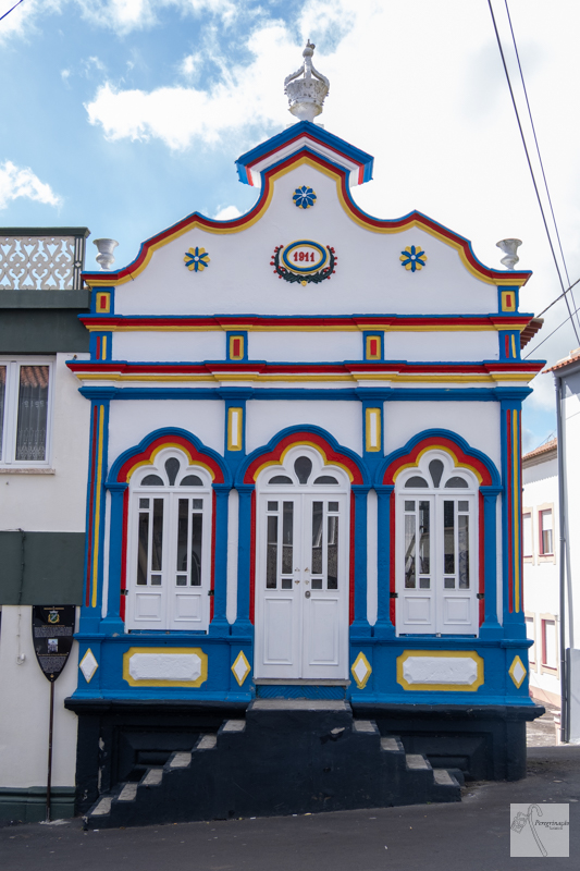 Após este último miradouro chegamos ao Nicho de Nossa Senhora e a partir daqui iniciamos a nossa descida ziguezagueando pelas ruas estreitas da freguesia. No alto passamos pelas primeiras redes sociais, ou seja, as pias, onde antigamente as senhoras lavavam a sua roupa e ainda passamos por um triatro do Espírito Santo que era muito colorido, na fachada tinha uma cartela onde estava gravada a data de 1911. As cores tornavam o triatro alegre, mas apesar de ser colorido e de não ter mudado de lugar só reparei nele no regresso. O percurso de volta ao carro levou-nos a passar pela sociedade da freguesia, a qual por ser Carnaval já estava cheia, não entramos, mas por certo se tivéssemos entrado haveria lugar para nós.